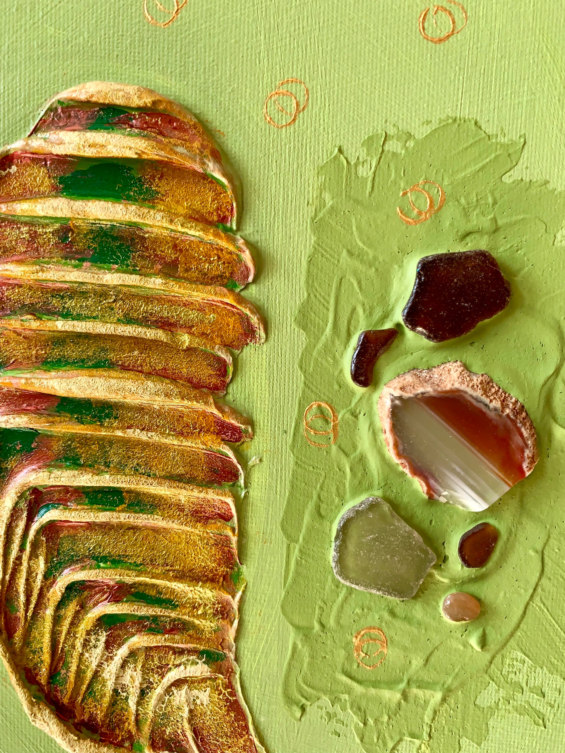 GREEN CIRCLE (2025) Diameter: 12" acrylic, texture medium, and sea glass on canvas