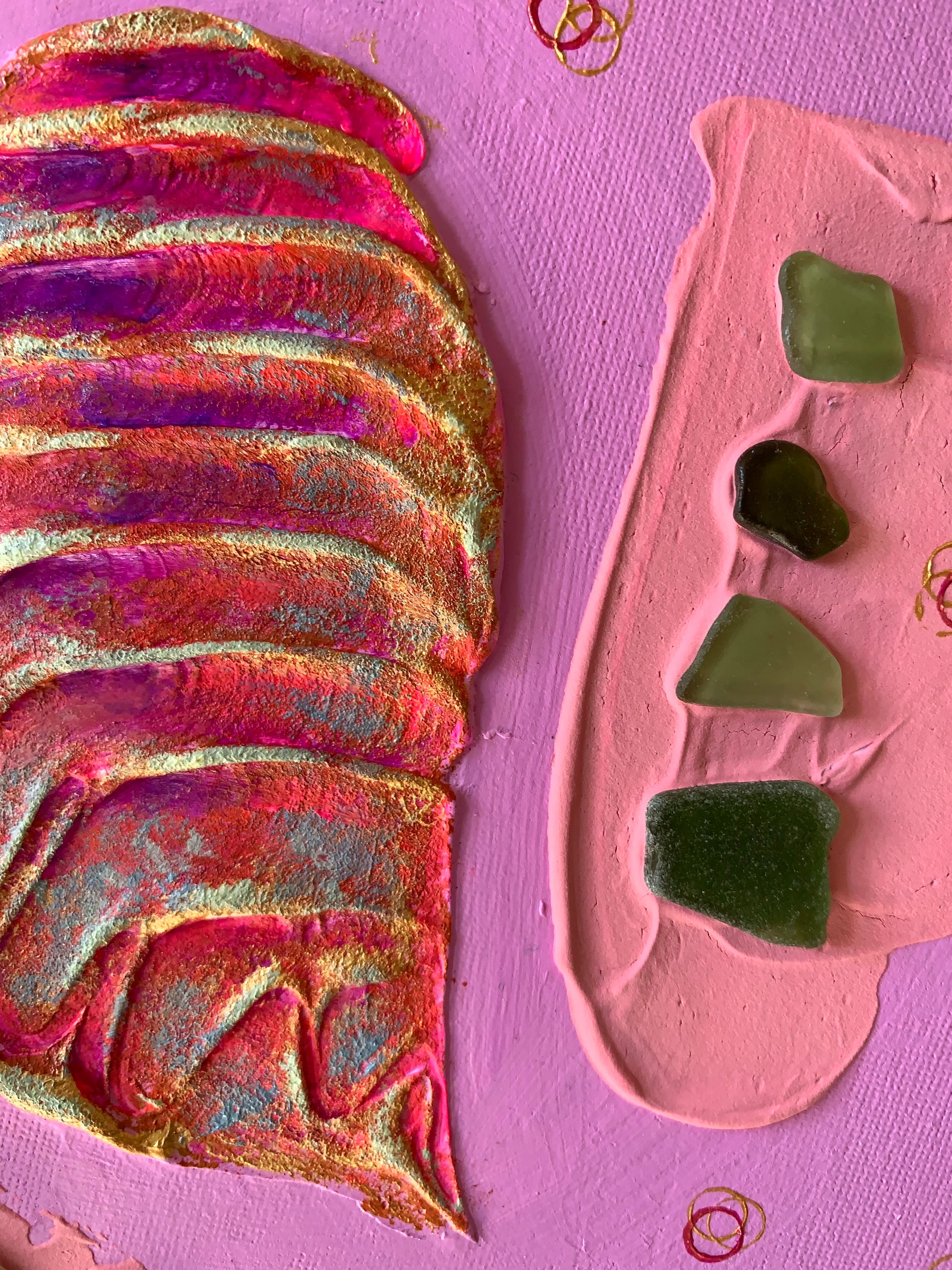 PINK CIRCLE (2025) Diameter: 12" acrylic, texture medium, and sea glass on canvas